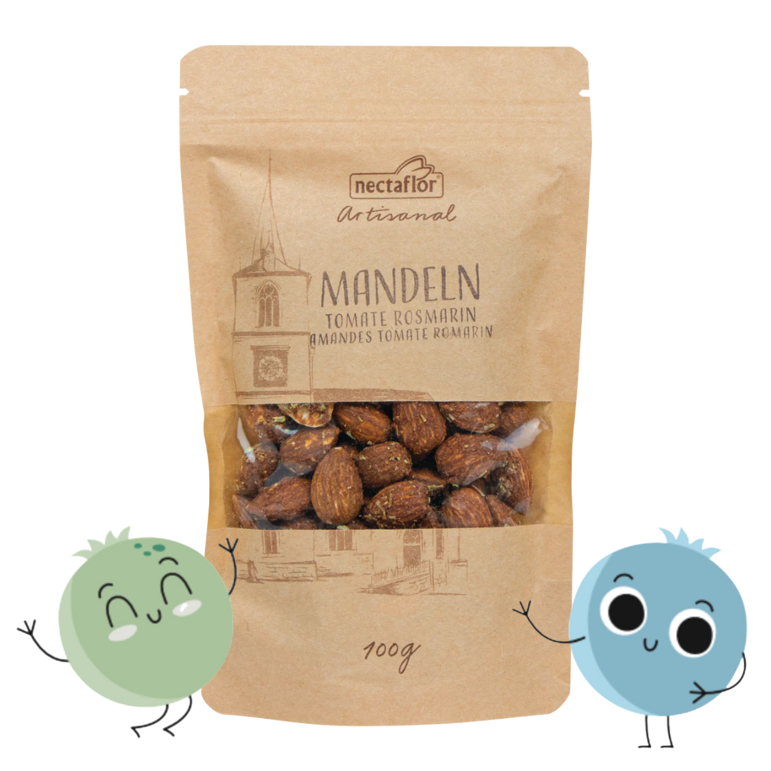 Die Mandeln Tomate Rosmarin von Nectaflor Artisanal werden in Kleinstchargen geröstet und von Hand mit einer Tomaten Rosmarin Würzung veredelt.